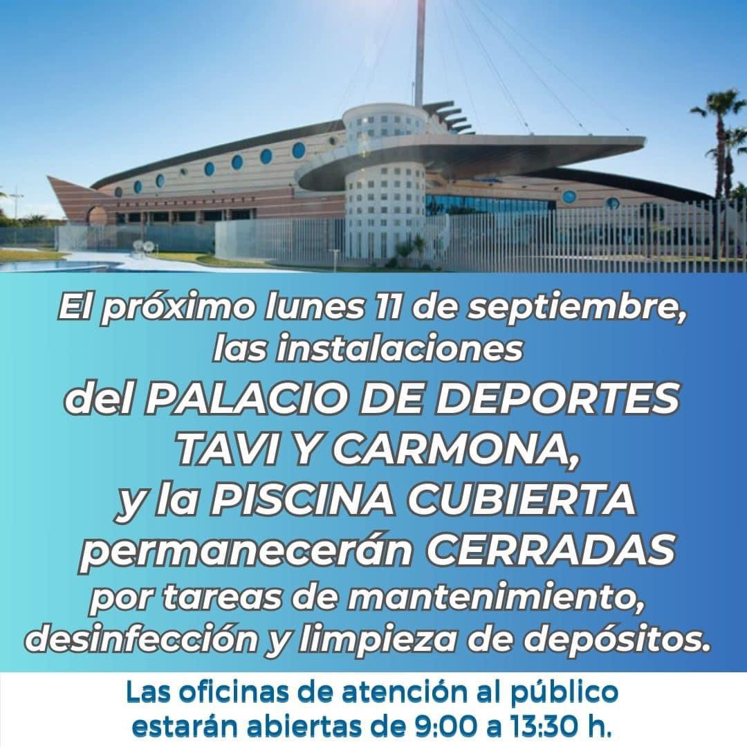 Home / Deportes / (Español) El próximo lunes 11 de septiembre, las instalaciones del Palacio de Deportes Tavi y Carmona, y la piscina cubierta permanecerán CERRADAS